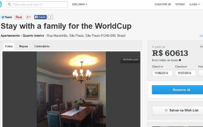 O valor pedido em alguns anúncios está muito acima do cobrado na média no período da Copa. O preço médio da diária (nacional), segundo o site, é de R$ 170, o que no mês soma R$ 5,1 mil – quase 12 vezes mais do que o cobrado pelo quarto do bairro paulistano de Higienópolis.
