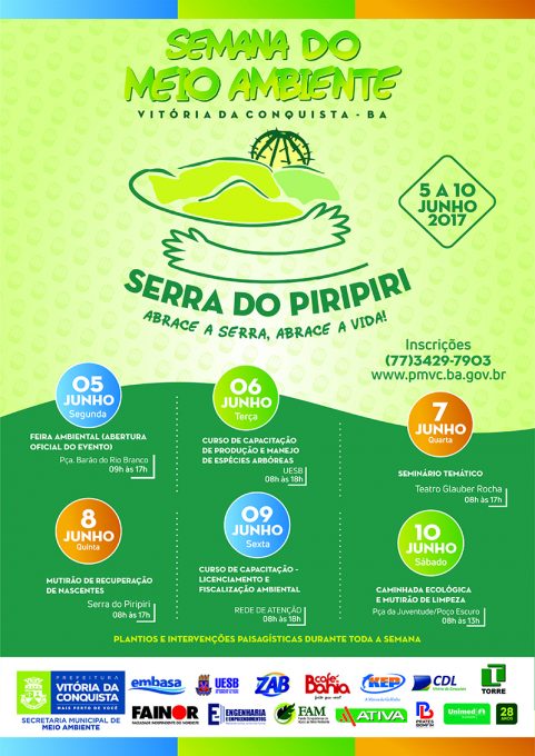 Com o tema “Serra do Piripiri. Abrace a Serra, abrace a vida!”, a Secretaria de Meio Ambiente, da Prefeitura Municipal de Vitória da Conquista, está com uma programação especial para a Semana do Meio Ambiente. De 5 a 10 de junho, diversas ações educacionais serão realizadas no sentido de fortalecer a Gestão Ambiental do município e despertar uma consciência coletiva sobre o assunto.